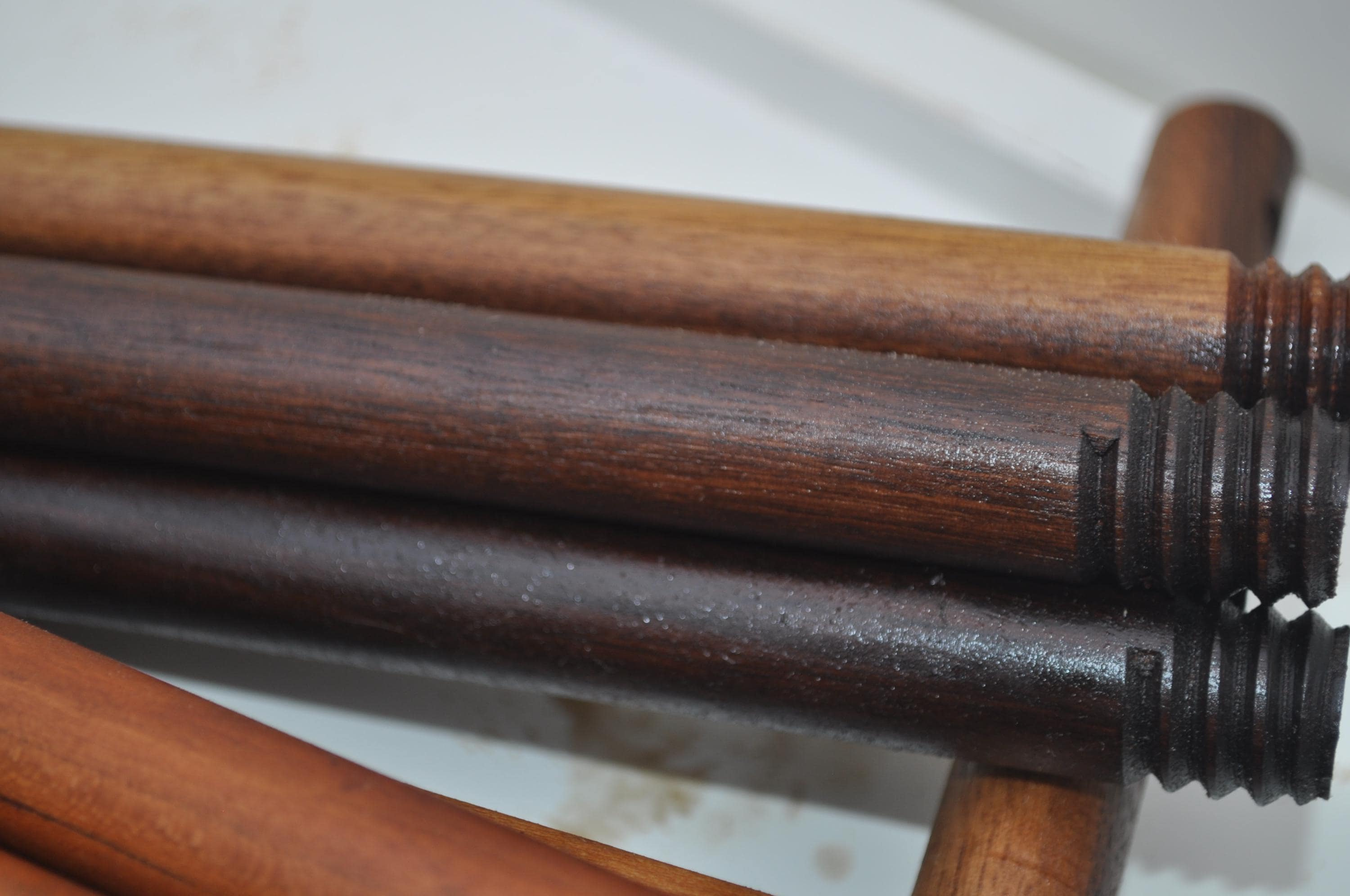 some of the threading will turn tight for while or may have a little thread show this is the nature of wood and use of a natural finish as Tung oil, or any finish like it will expand the wood fibers, cells this is what water proofs the masher, in a safe natural manner , the application of 4 coats takes about 2 weeks